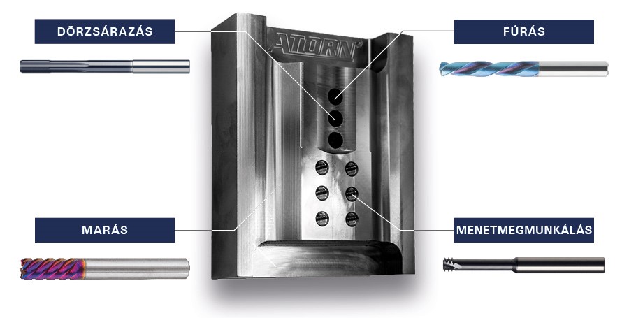 Két különböző folyamat és négyféle munka áll rendelkezésre az Ön számára az ATORN menetprogramban edzett anyagokban készült menetek előállításához (48 HRC-től). A menetet ATORN menetfúróval vagy ATORN menetmaróval is elékszíthetjük.